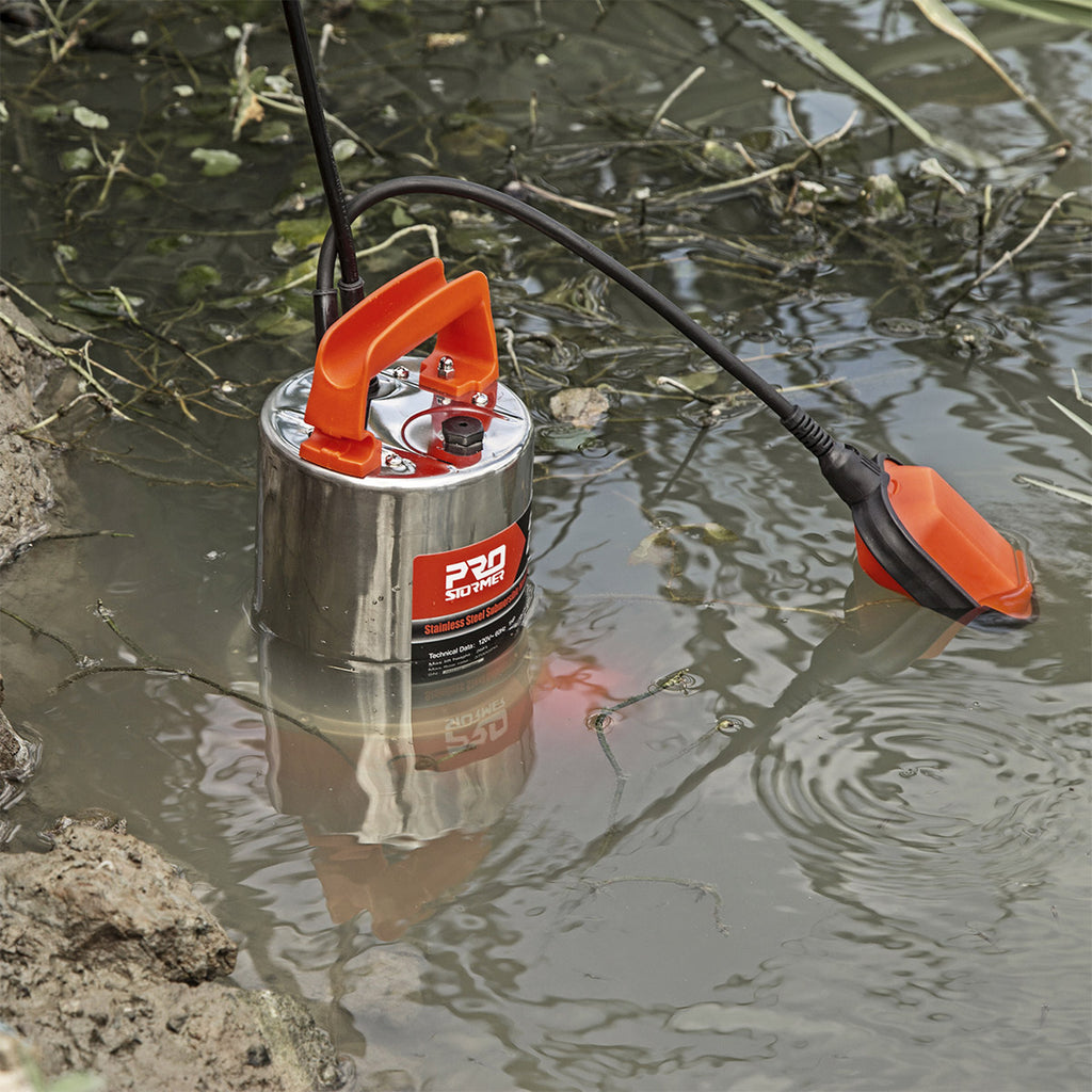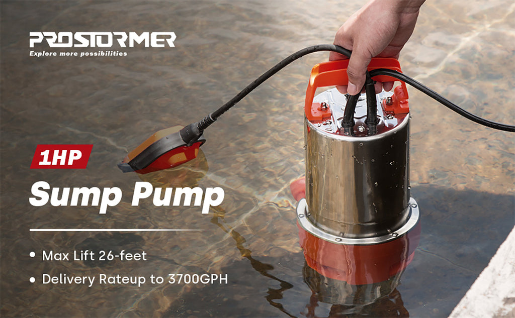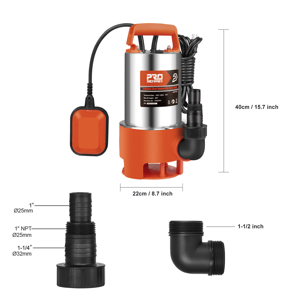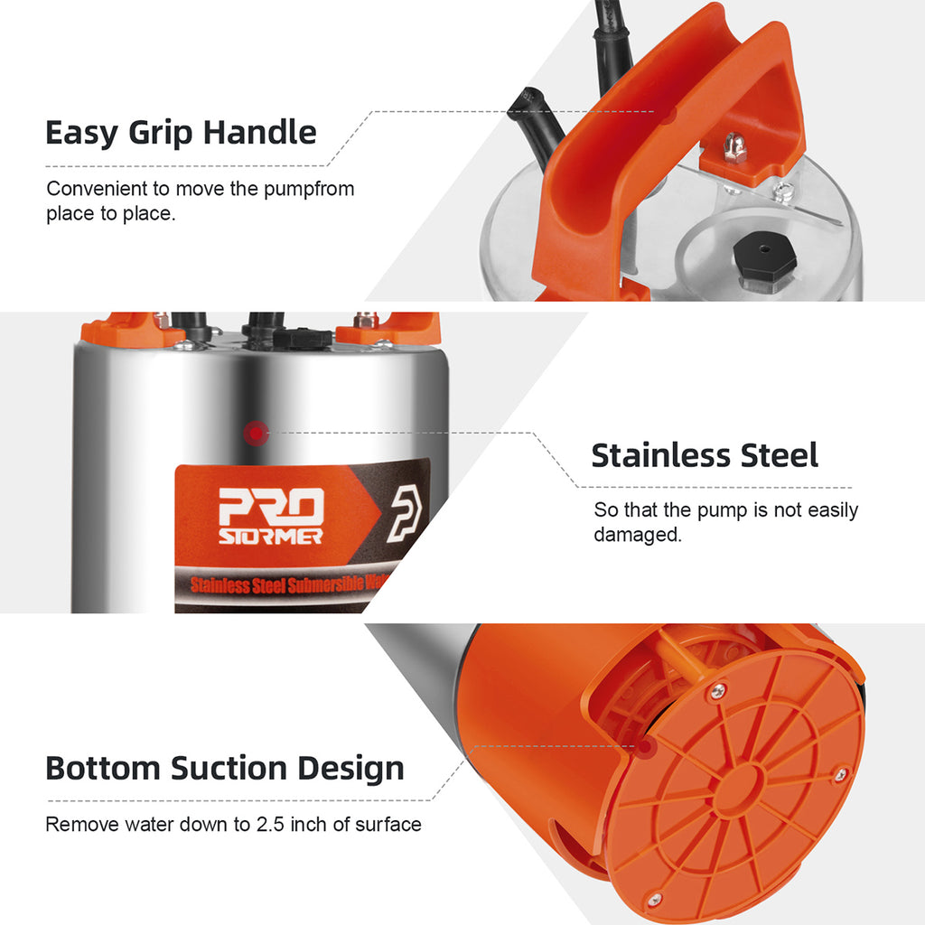 Prostormer portable submersible pump with float switch is designed for clean/dirty water removal, swimming pool drain, garden pond drain, flood drain, etc. sump pump can work up to 14000L/H. The design of a higher base filters debris and minimizes clogging. It is a sump pump made of Stainless Steel material. Equipped with a suction screen, this pump can filter out large debris with ease.